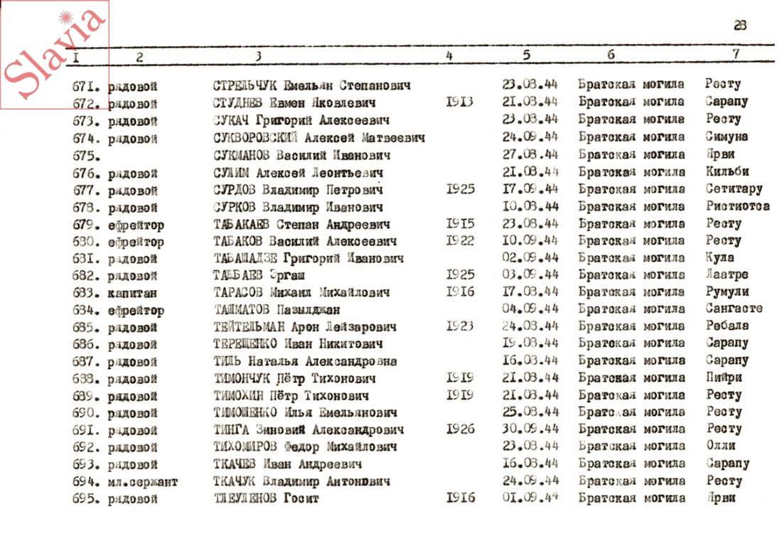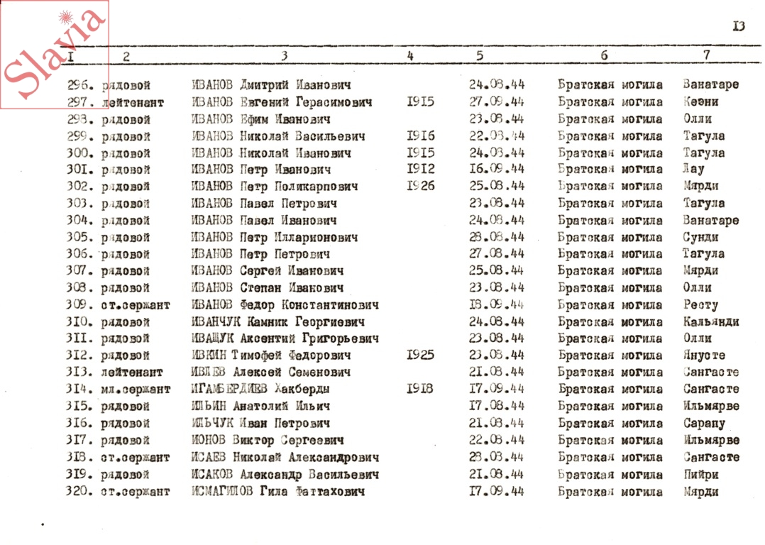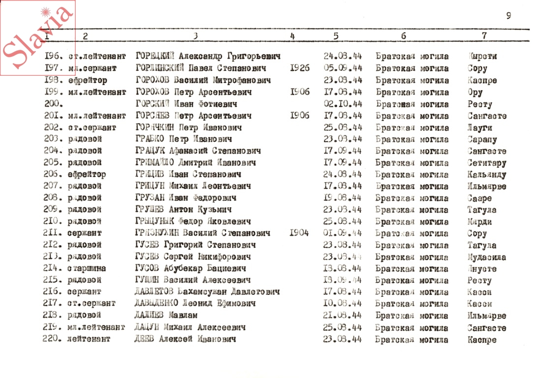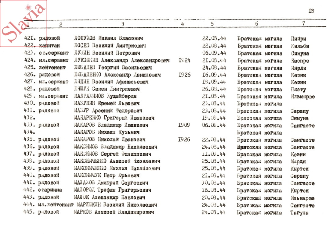 ПЕРСОНАЛЬНЫЕ СВЕДЕНИЯ О ЗАХОРОНЕННЫХ В БРАТСКОЙ МОГИЛЕ (по состоянию на 12 августа 1991 г.)