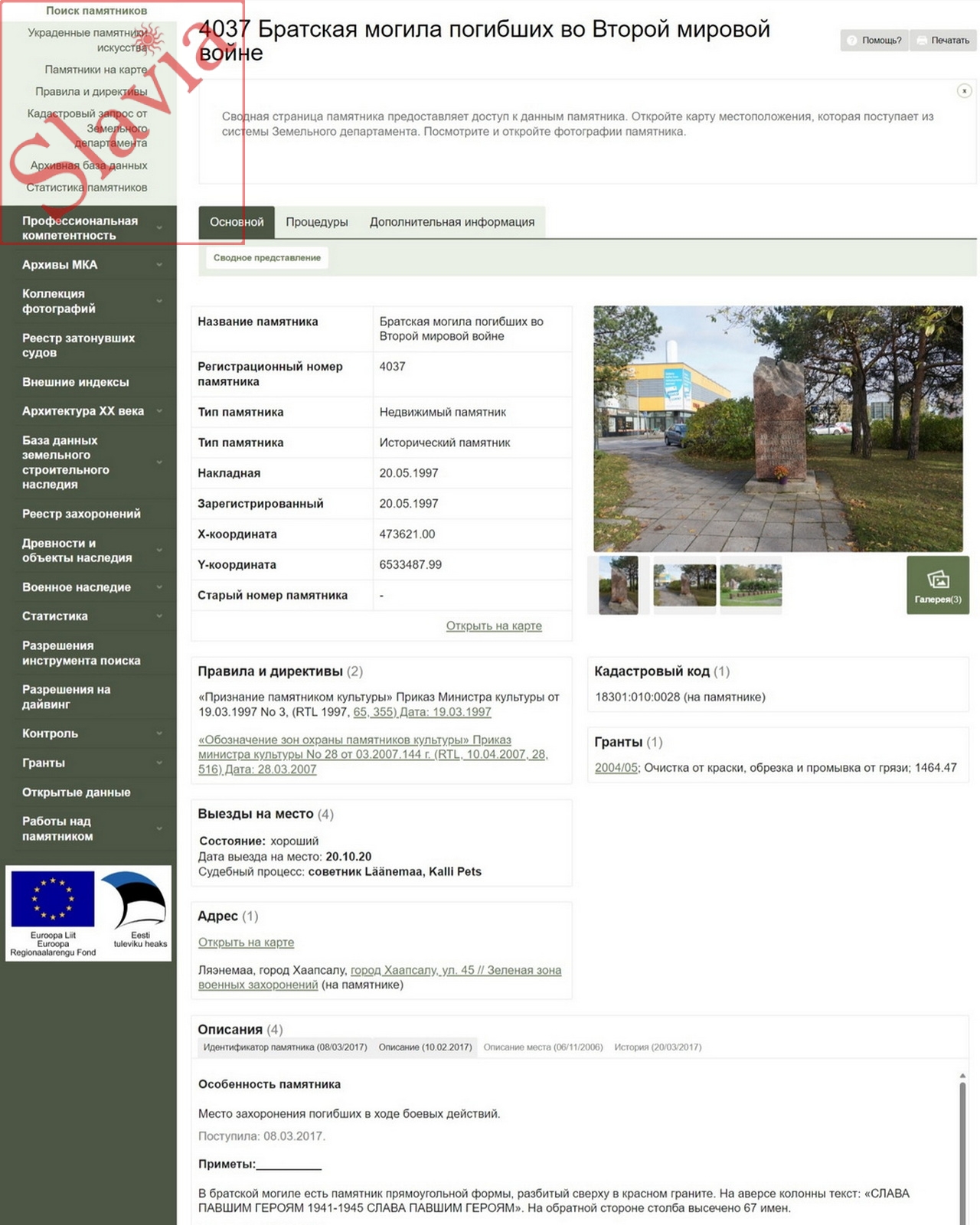 Реестр памятников культуры: «Братская могила находится на разветвлении улицы Пости, Таллиннского шоссе и Лихула-роуд. Братская могила имеет памятник прямоугольной формы, разбитый сверху красным гранитом. На аверсе столба надпись: "СЛАВА ПАВШИМ ГЕРОЯМ 1941-1945 СЛАВА ПАВШИМ ГЕРОЯМ". На обратной стороне столба 67 имен. Памятник был установлен в 1982 году. Автором является М. Палм.». «Признание памятником культуры» Приказ Министра культуры от 19.03.1997 No 3, (RTL 1997, 65, 355) Дата: 19.03.1997