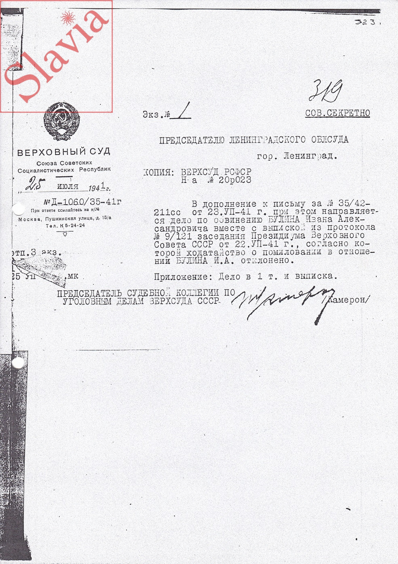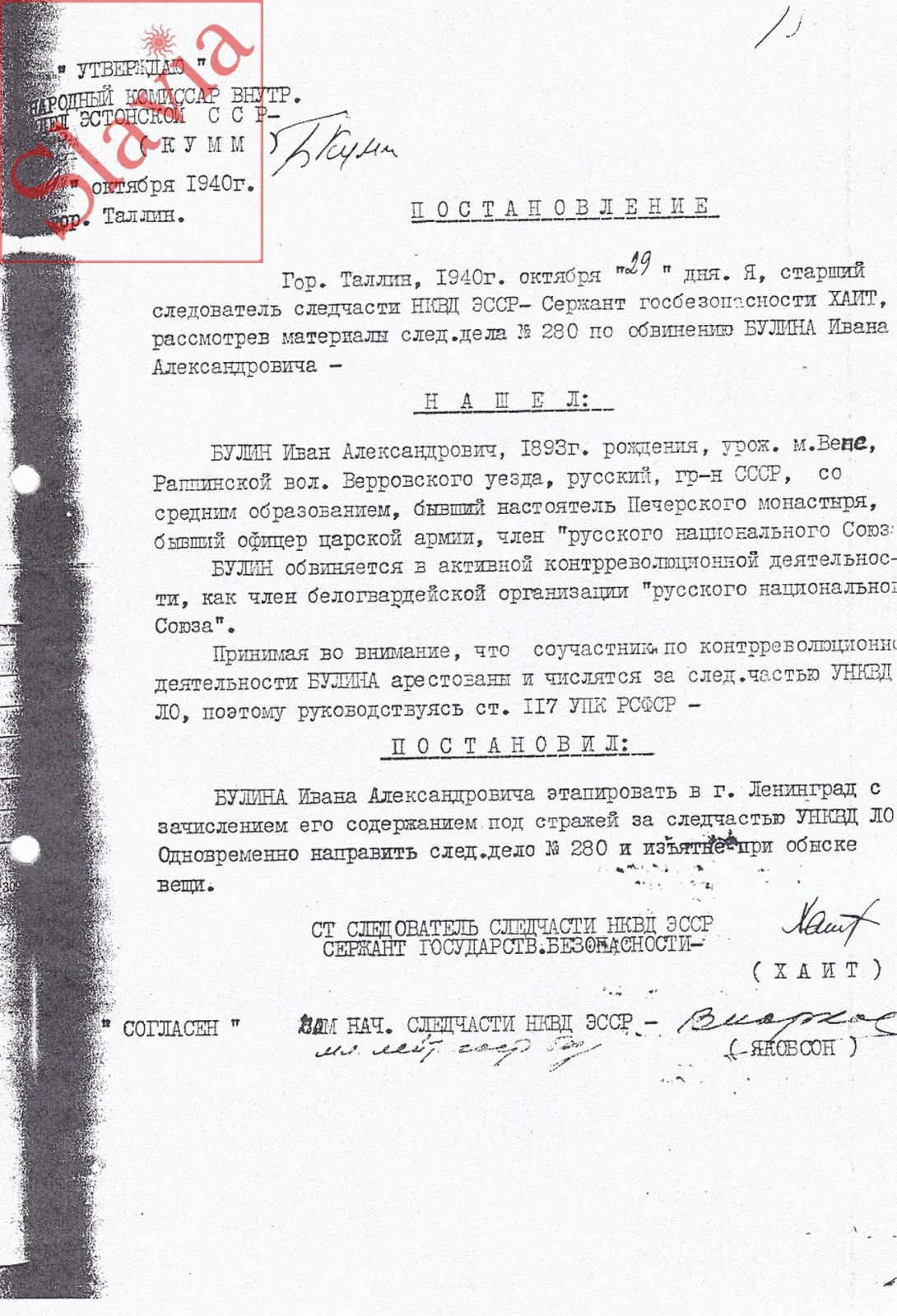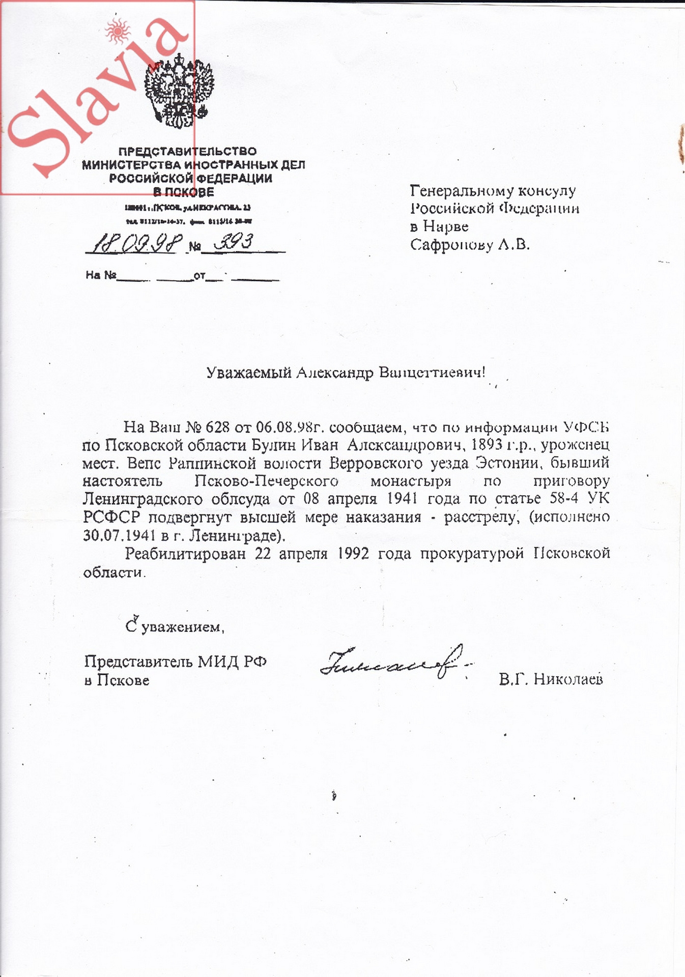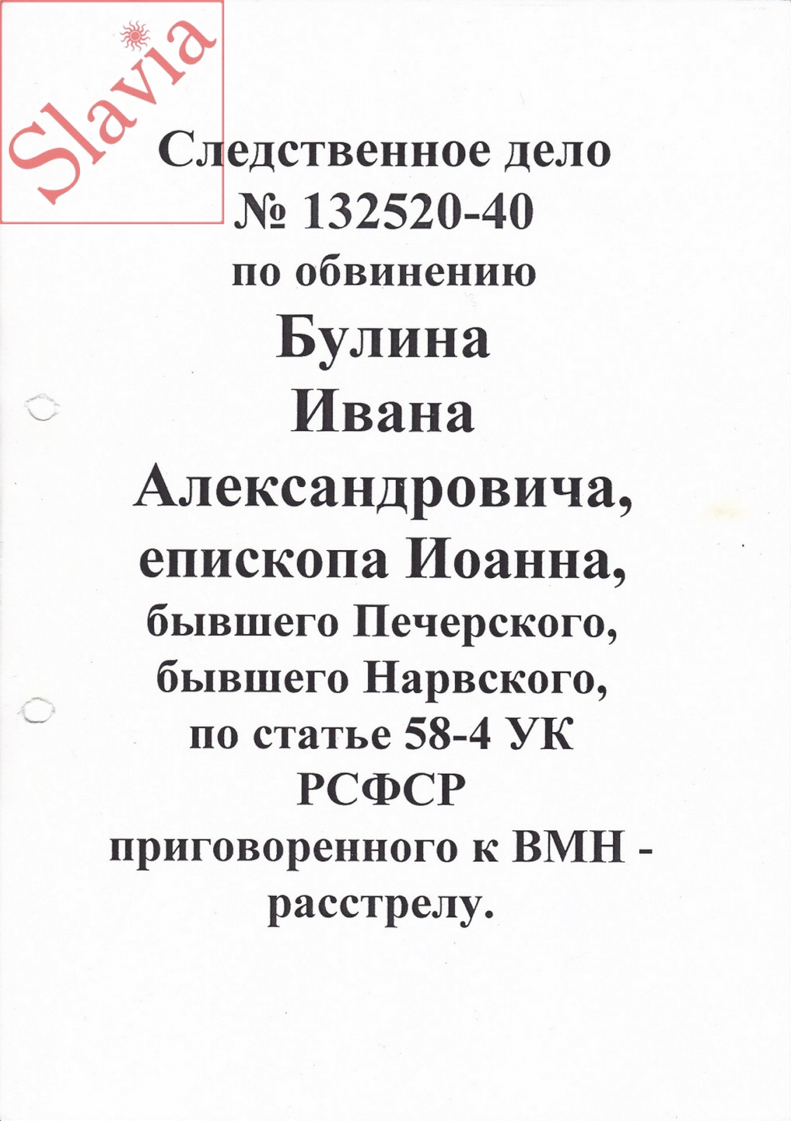 Сухие строчки официального письма от 18 сентября 1998 года извещают: «Булин Иван Александрович, 1893 г.р., уроженец мест. Вепс Раппинской волости Верровского уезда Эстонии, бывший настоятель Псково-Печерского монастыря по приговору Ленинградского облсуда от 8 апреля 1941 года по статье 58-4 УК РСФСР подвергнут высшей мере наказания – расстрелу (исполнено 30.07.1941 в г.Ленинграде)».