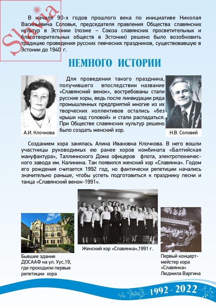 В 1992 г. в г.Таллине, при Союзе славянских просветительных и благотворительных обществ Эстонии, был создан женский хор «Славянка», который постепенно из любителей пения вырос в академический хор. В репертуаре хора произведения разного жанра: хоровая классика, духовная музыка, популярные песни и романсы, народные песни, исполняемые на русском, эстонском, белорусском, украинском, армянском языках. Хор - участник XXY Певческого праздника Эстонии, всех праздников песни и танца «Славянский венок», фестиваля русских академических хоров «Хрустальный ключ», организатором которого является Русское хоровое общество в Эстонии. Концертная деятельность хора охватывает не только Таллин, но и другие города Эстонии. Создателем хора, его бессменным руководителем и дирижером с момента его создания является Алина Клочкова, заслуженная артистка России, лауреат музыкальной премии им. Александра Архангельского, премии по культуре им. Игоря Северянина, премии благотворительного фонда «Благовест». Хормейстер – Гоар Овакимян. Концертмейстер – Ольга Куликова. Творческая деятельность хора отмечена почетными дипломами, призами, грамотами.