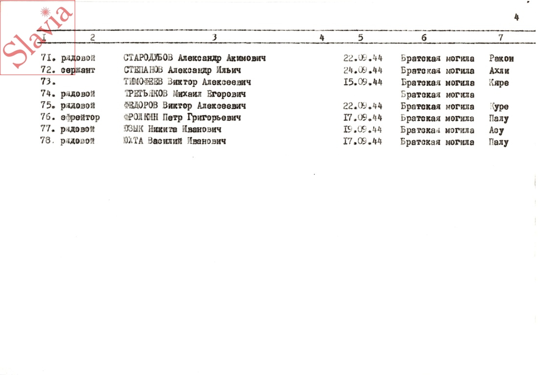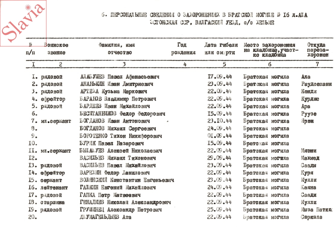 ПЕРСОНАЛЬНЫЕ СВЕДЕНИЯ О ЗАХОРОНЕННЫХ В БРАТСКОЙ МОГИЛЕ (по состоянию на 12 августа 1991 г.)