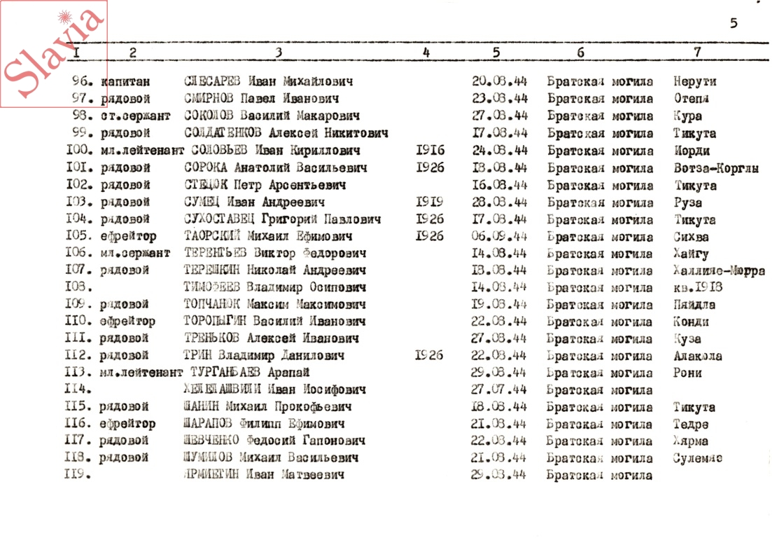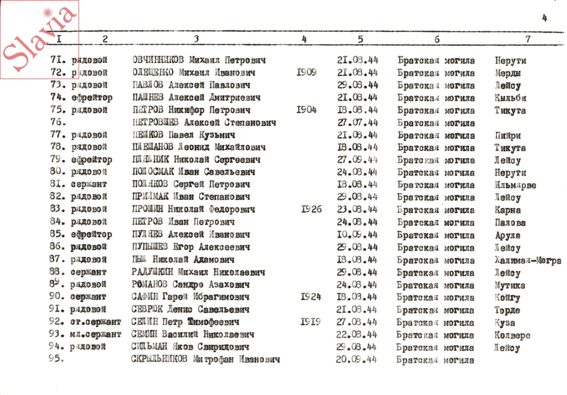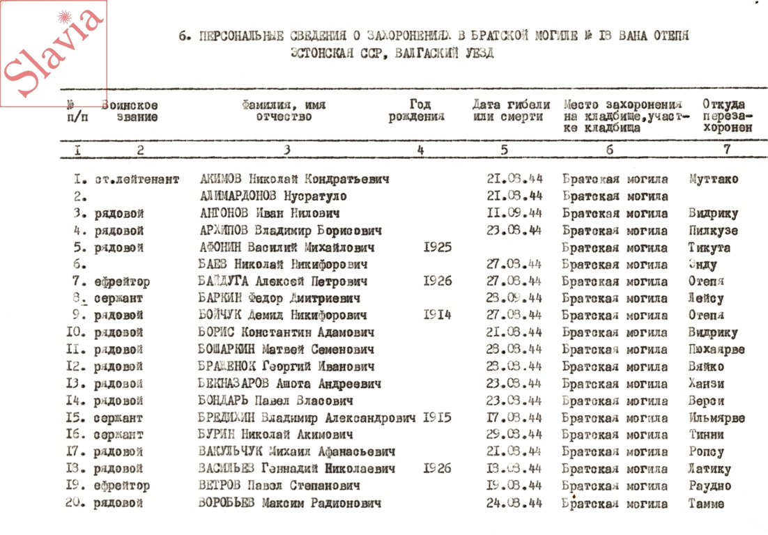 ПЕРСОНАЛЬНЫЕ СВЕДЕНИЯ О ЗАХОРОНЕННЫХ В БРАТСКОЙ МОГИЛЕ (по состоянию на 12 августа 1991 г.)
