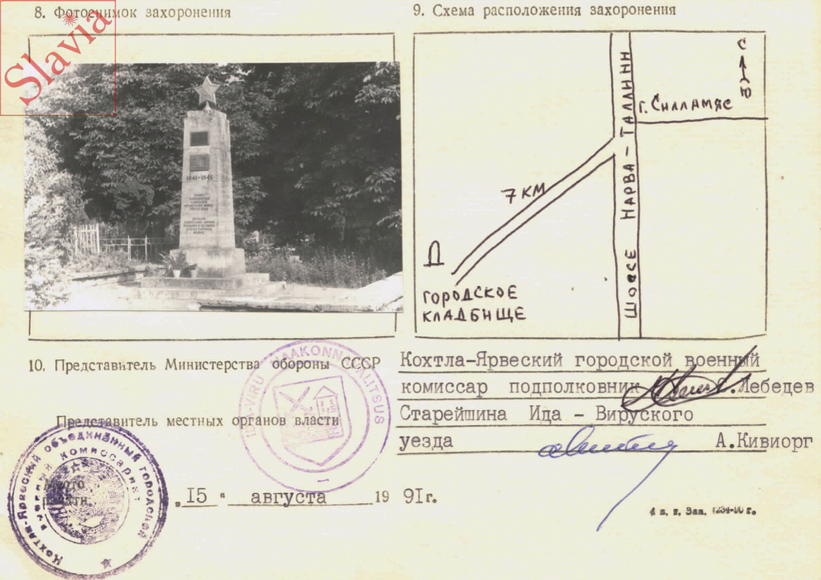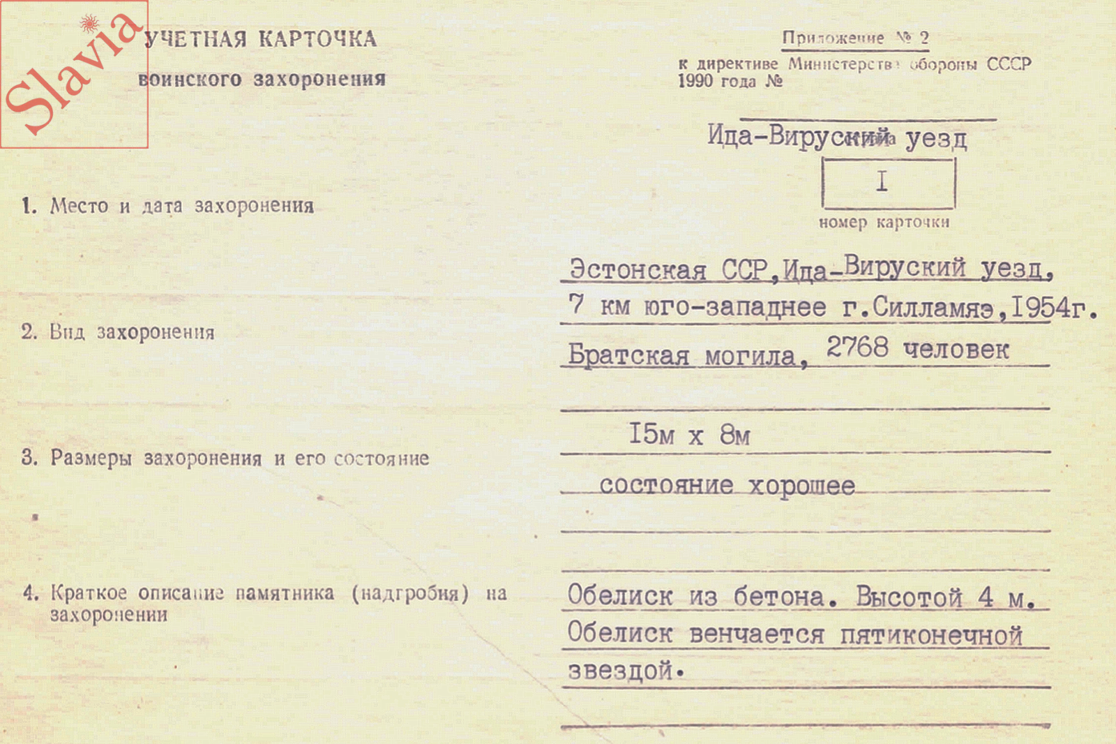 Реестр памятников культуры: «По данным Военного комиссариата ЭССР, здесь похоронено 3000 павших. Памятник был установлен в 1953 году. Братская могила отмечена памятником на доломитовом ступенчатом основании. Размеры: 1-я степень 232x232x16 см. 2-я степень 180x180x16 см. Плинтус 105x105x47 см. Столб 80x80x240см. Столб имеет основание высотой 15 см с пятиугольником сверху. На столбе над табличкой из черного камня, на ней бронзовая пластина. Буквы рельефные. "Вечная слава воинам / 256 НКСД павшим в боях / на плацдарме за освобождение / города НАРВА в 1944 г. / От ветеранов 256 / Нарвской Краснознаменной / стрелковой дивизии". В центральной части столба установлена пластина из искусственного камня и на ней медная листовая пластина с надписью: «Вечная слава воинам / 314 с.д. павшим в боях на / плацдарме р. Нарва / в 1944. году / Северо – Казахстанцы». Текст вырезан и окрашен в черный цвет внизу: "1941-1945". В нижней части столба находится текст на эстонском и русском языках: «В Великой / Отечественной войне / павшие / Советская армия / бойцы». За колонной гробница с различными надгробными досками.».