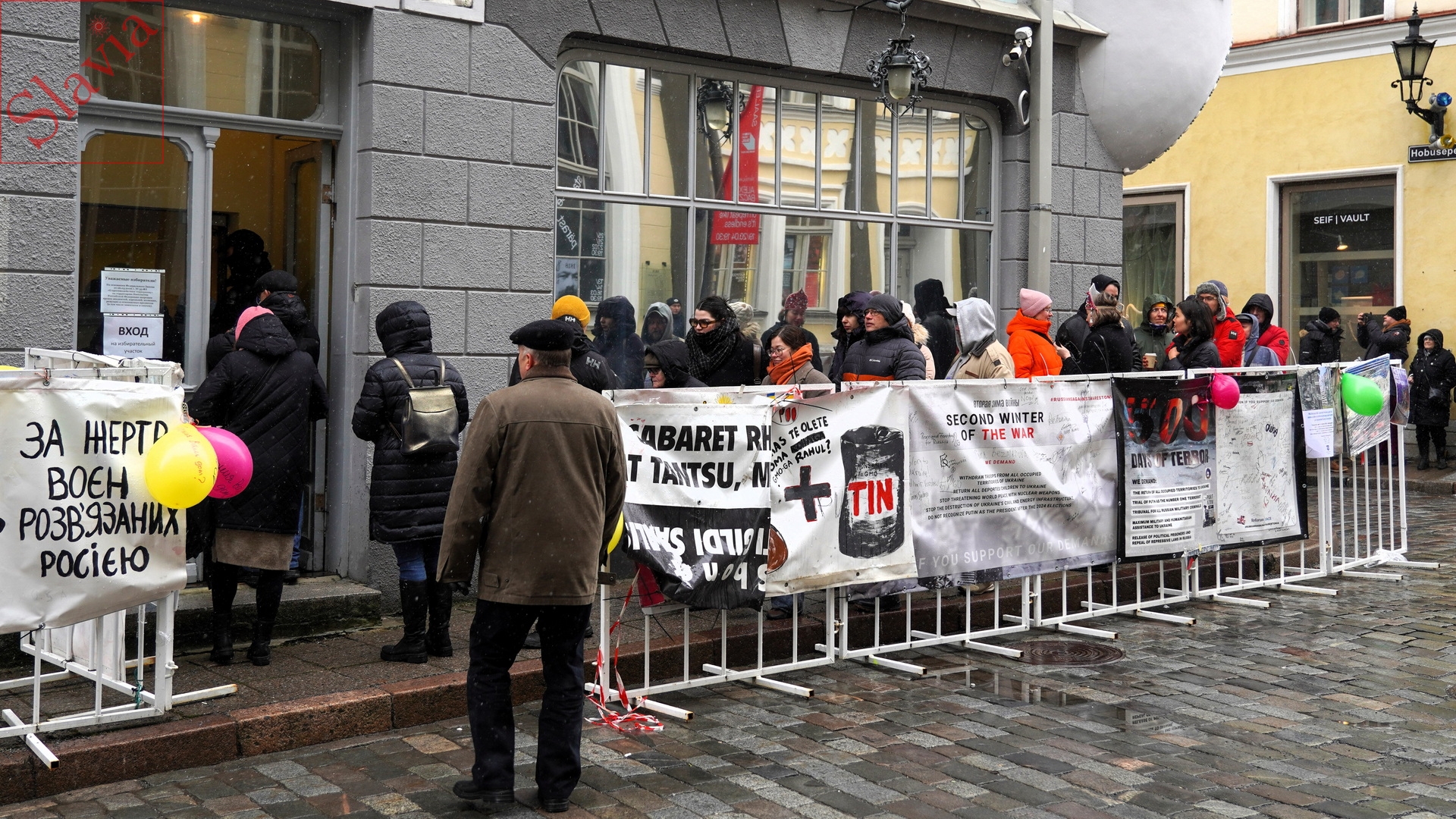 17 марта у здания Посольства РФ в Таллине, под присмотром усиленных нарядов полиции, собрались как желающие проголосовать, так и протестующие. Причем желающих проголосовать было значительно больше трёх-четырёх десятков протестующих.