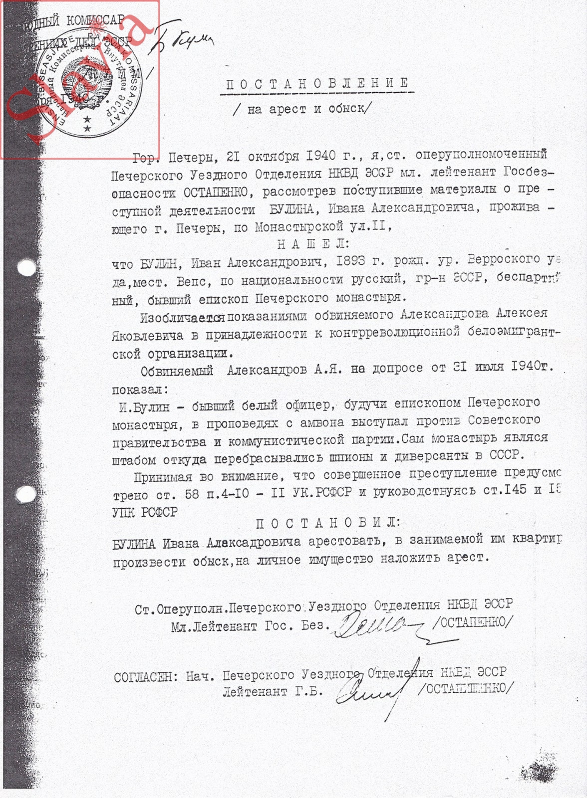 Сухие строчки официального письма от 18 сентября 1998 года извещают: «Булин Иван Александрович, 1893 г.р., уроженец мест. Вепс Раппинской волости Верровского уезда Эстонии, бывший настоятель Псково-Печерского монастыря по приговору Ленинградского облсуда от 8 апреля 1941 года по статье 58-4 УК РСФСР подвергнут высшей мере наказания – расстрелу (исполнено 30.07.1941 в г.Ленинграде)».